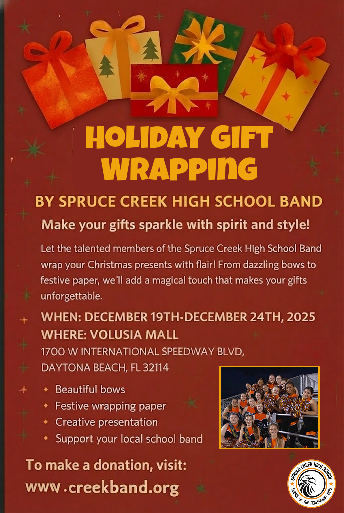 Let the talented members of the Spruce Creek High School Band wrap your Christmas presents with flair! From dazzling bows to festive paper, we'll add a magical touch that makes your gifts unforgettable.